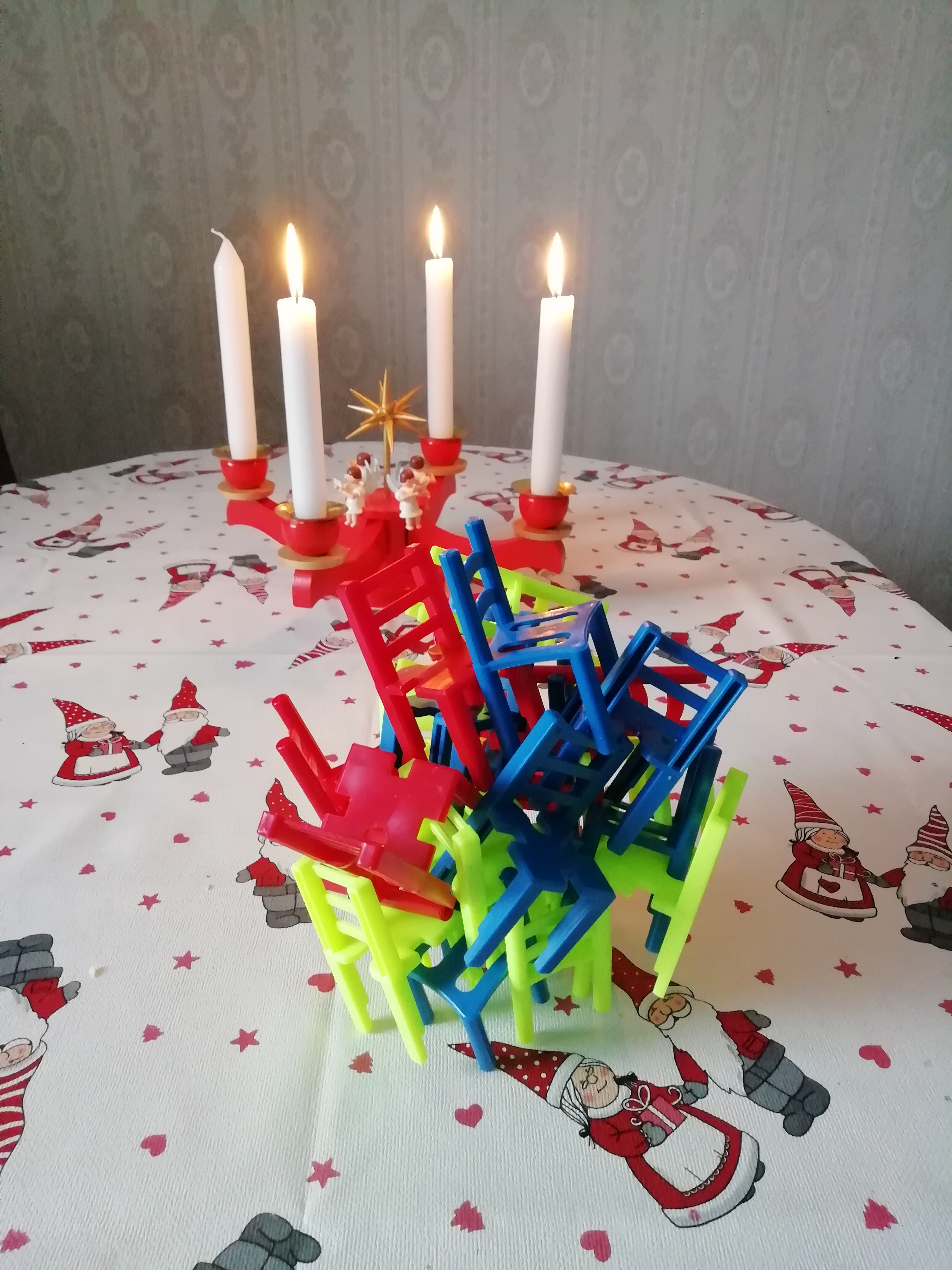 Am Nachmittag wurde schon die dritte Adventskerze angezündet. Wie schnell doch die Zeit vergeht bemerkte Mama Bella. Wir müssen unbedingt noch ein paar Plätzchen backen, den die Ersten gehen schon langsam zu neige. Ravi hatte am liebsten sofort angefangen. Er liebt es in der Küche Mama beim Backen zu helfen. Hinter der Küchentür hat Papa Silas extra einen Hacken angebracht an dem Ravis Küchenschürze hängt. Er wollte gerade schon los sputen, da konnte Mama Bella ihn gerade noch ausbremsen. Lasst uns doch heute gemeinsam ein paar Runden spielen. Worauf habt ihr Lust? Aron holte den Karton mit den Stapelstühle und sie waren beide schon richtige kleine Profis geworden. Nach ein bisschen Übung hatte es Mama Bella auch gut drauf.