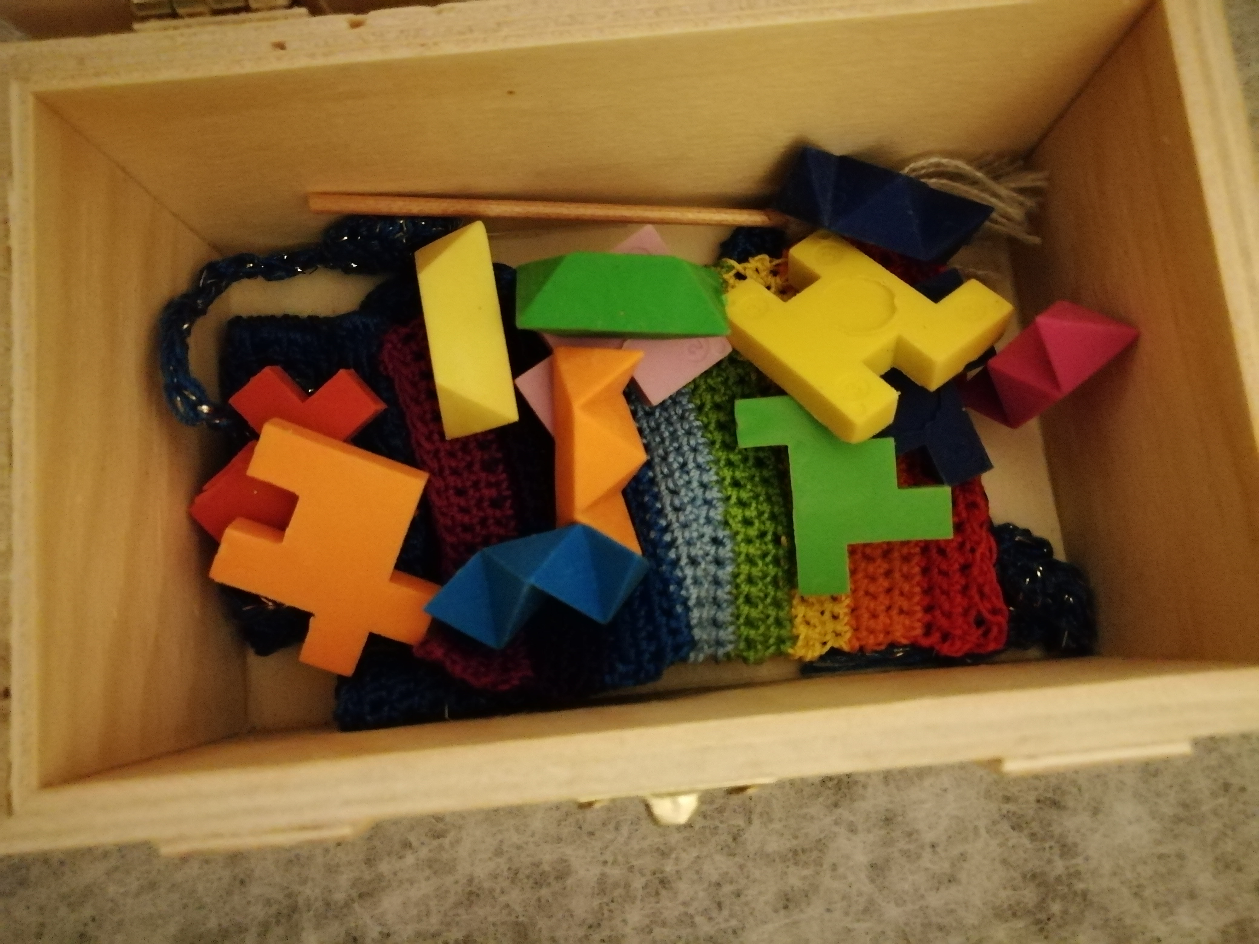 Beim auspacken meiner Umzugskiste fiel mir auf, das Einzel Teile verstreut in der Kiste lagen. Ich weiß genau das sie ganz waren, als wir sie eingepackt habe. Könnt ihr mir bitte helfen sie zusammen zu fügen. Ihr findet die Einzelteile in der Umzugskiste. Die flachen Eckigen kann Ravi zusammen bauen. Die am Ende spitzer zu gehen schafft Aron sicherlich leicht.